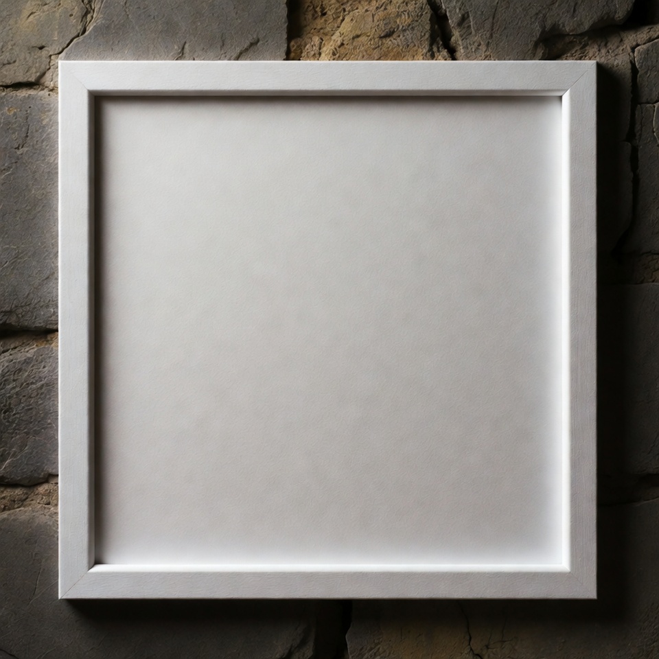 A simple white frame rests against a textured stone wall, showcasing an empty canvas. The setting emphasizes the contrast between the materials.
