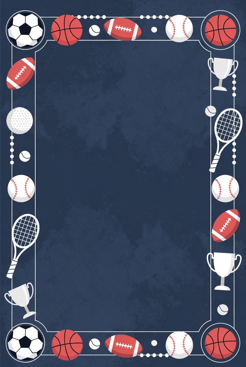 art, athletics, baseball, basketball, border, colorful, competition, decoration, design, equipment, fun, games, illustrations, navy background, playing, soccer, sports, sports accessories, tennis, trophies