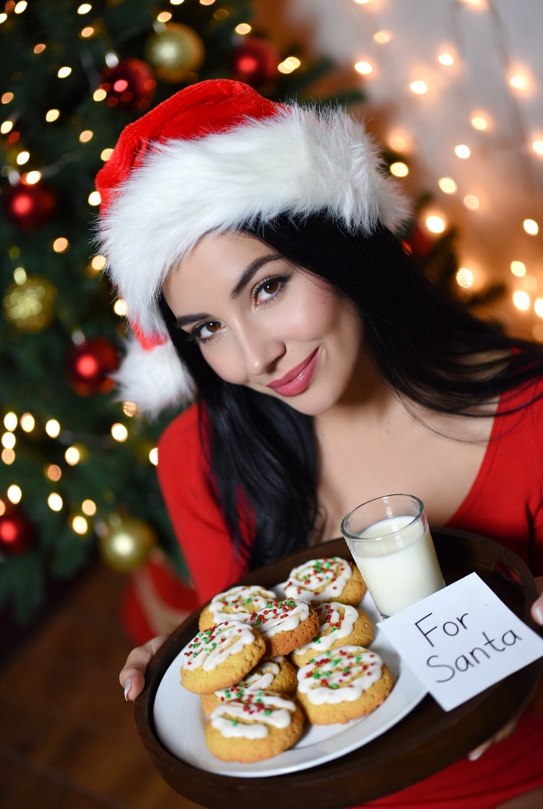 A woman wearing a red outfit and Santa hat holds a plate of cookies and a glass of milk, ready to delight Santa during Christmas.