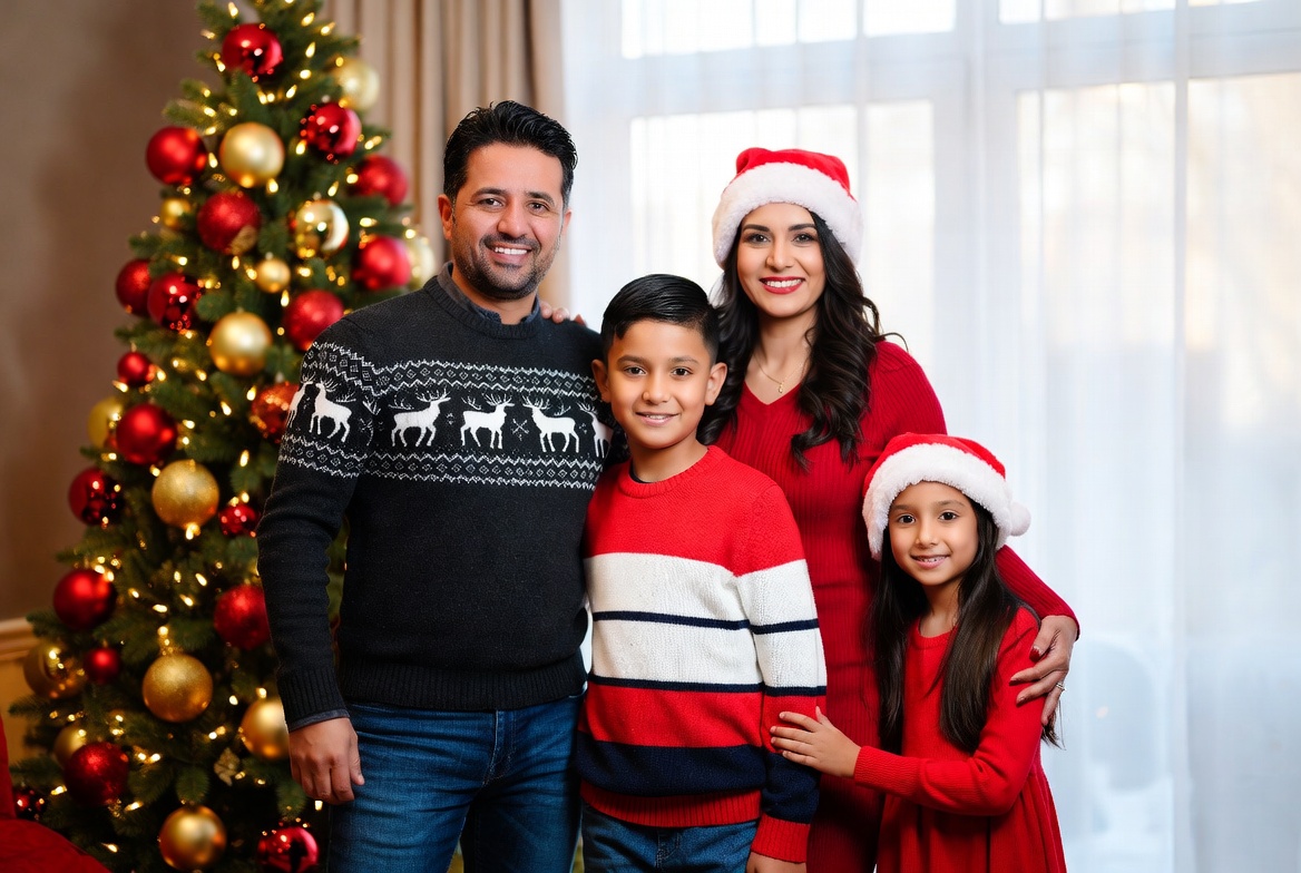 A cheerful family poses in festive outfits by a decorated Christmas tree, enjoying a joyful moment during the holiday season.