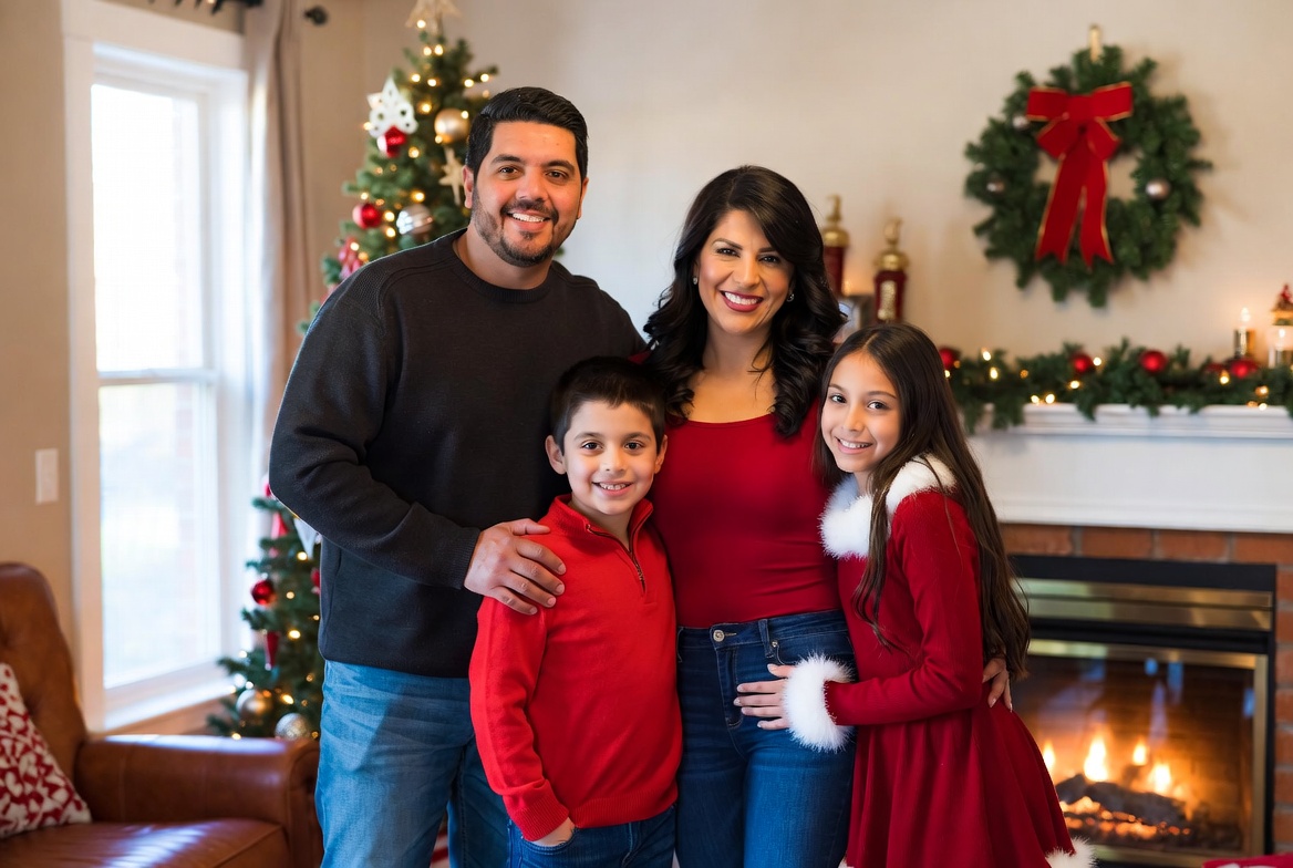 Christmas, celebration, children, cozy, decoration, family, festive, fireplace, gathering, happiness, holiday, indoor, joy, love, red outfits, smiling, together, tree, warmth, winter