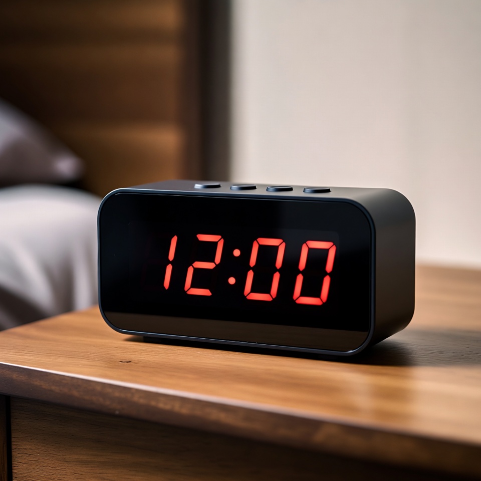 A sleek digital clock displays 12:00 on a bedside table in a cozy bedroom, surrounded by soft bedding and warm lighting.
