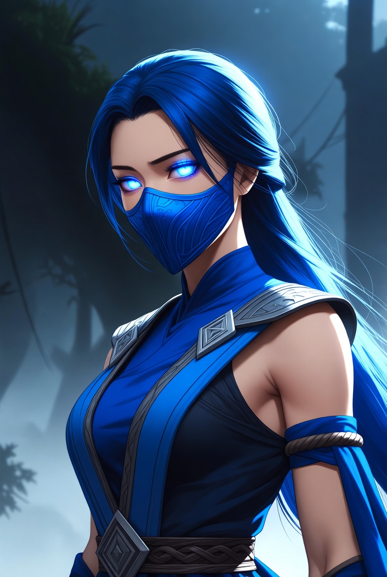 A skilled warrior with blue hair and glowing blue eyes stands in a misty forest. She wears a blue mask and is ready for action.