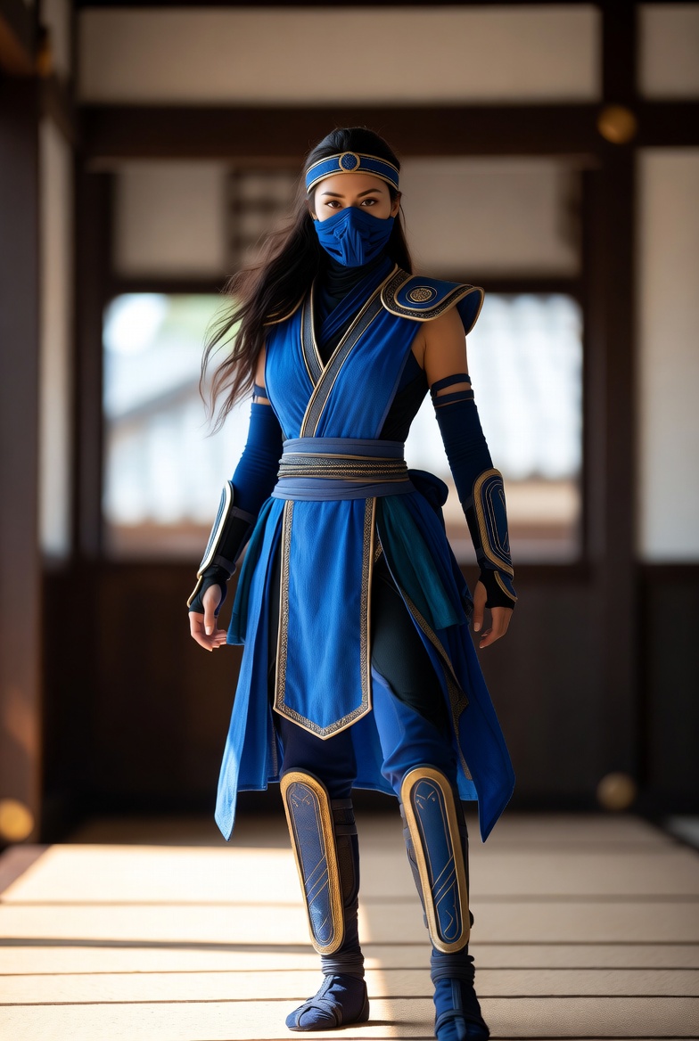 Asian architecture, action, battle pose, blue outfit, character design, competition, confident stance, costume, craft, discipline, dojo, martial artist, martial arts, performance, skilled warrior, sport, stylized, technique, traditional setting, training