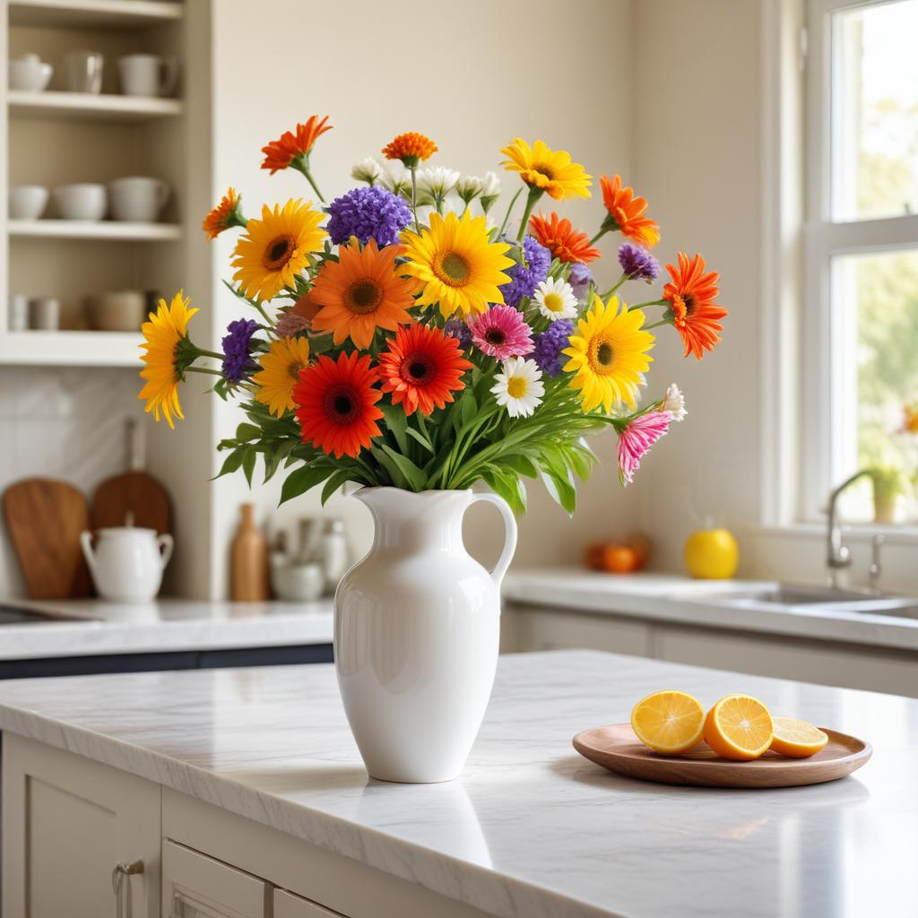 Colorful flowers fill a white vase on a kitchen counter. Fresh oranges are nearby, adding a cheerful touch to the bright space.