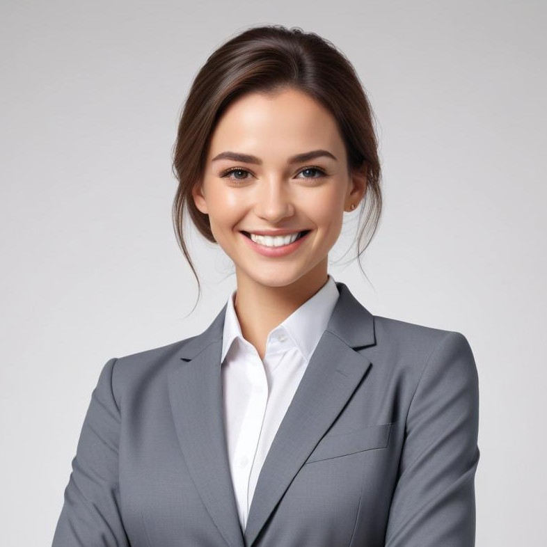 adults, attire, business, businesswoman, career, communication, confidence, empowerment, expression, fashion, gray suit, hairstyle, happy, leadership, portrait, professional, smile, standing, success, workplace