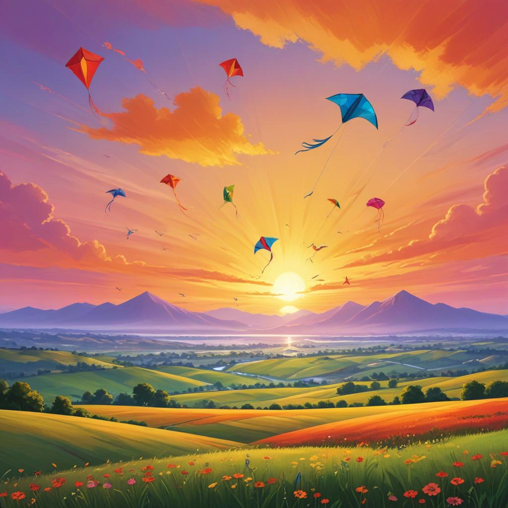 Colorful kites fly high in the sky as the sun sets behind rolling hills. The landscape is vibrant, filled with flowers and a distant lake.