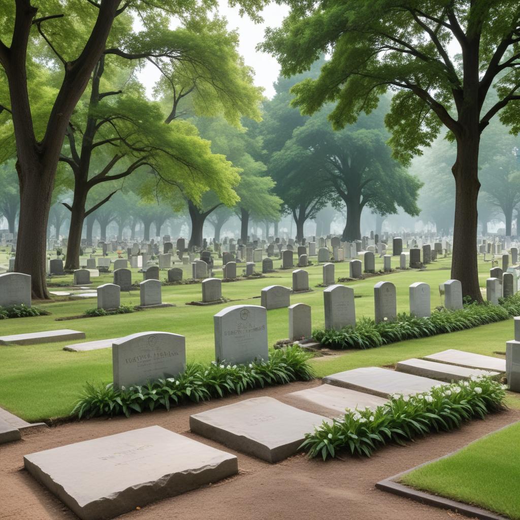 Lush, green trees surround well-kept gravestones in a tranquil cemetery. Morning light casts a soft glow over the serene landscape.