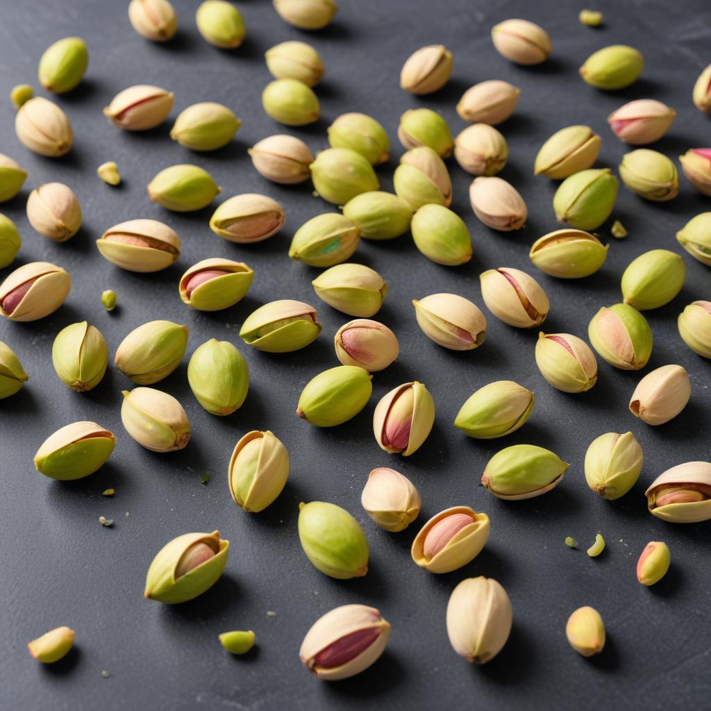 Pistachio nuts are scattered across a dark surface, showcasing their unique shapes and colors.