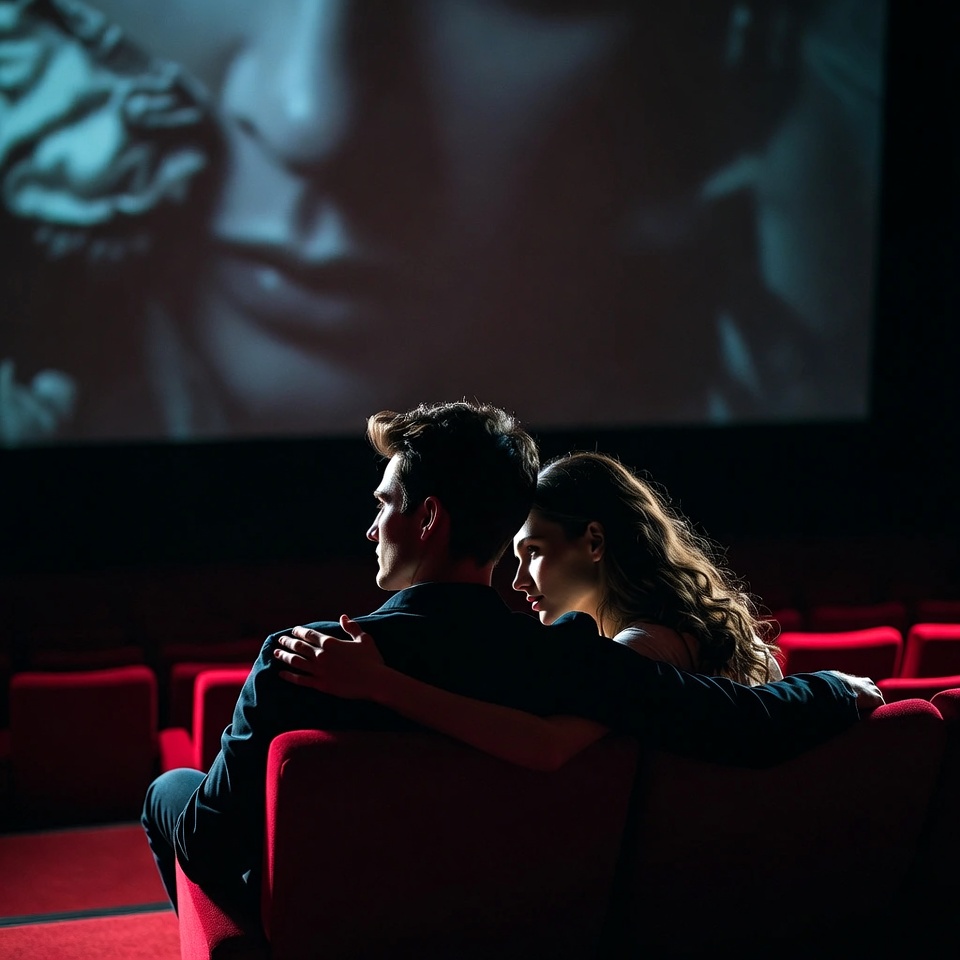 affection, cinema, close, couple, dark, emotions, entertainment, film, intimacy, movie, night out, projection, red seats, relationship, romance, screen, seating, theater, togetherness, watching