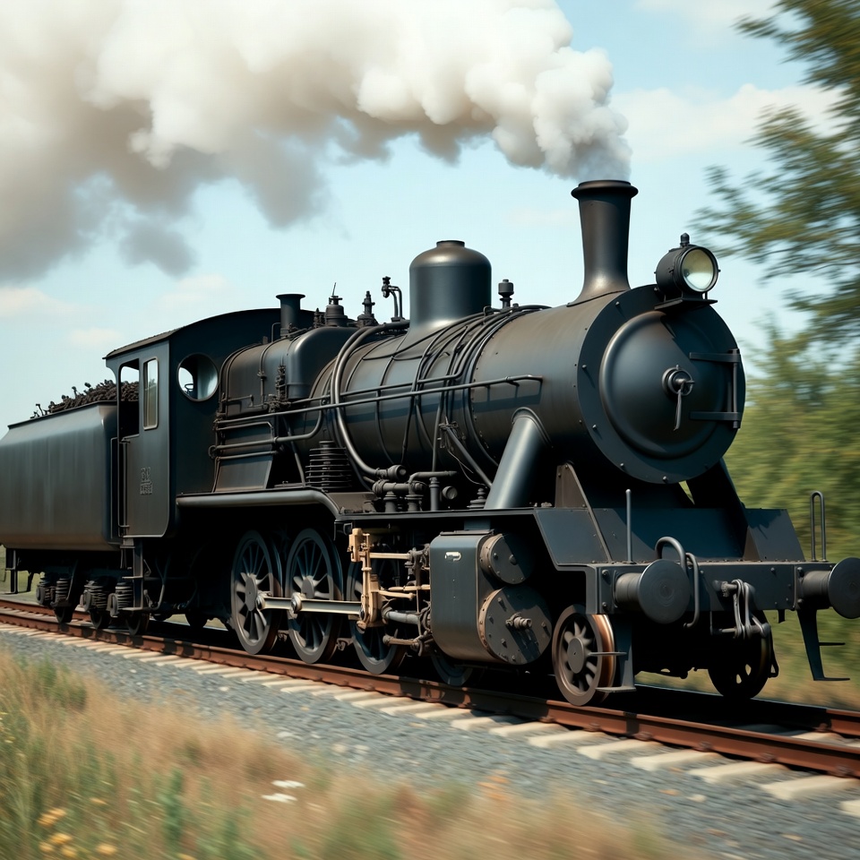 A vintage steam locomotive travels along the railway in a scenic landscape, showcasing its historic design and releasing clouds of steam.