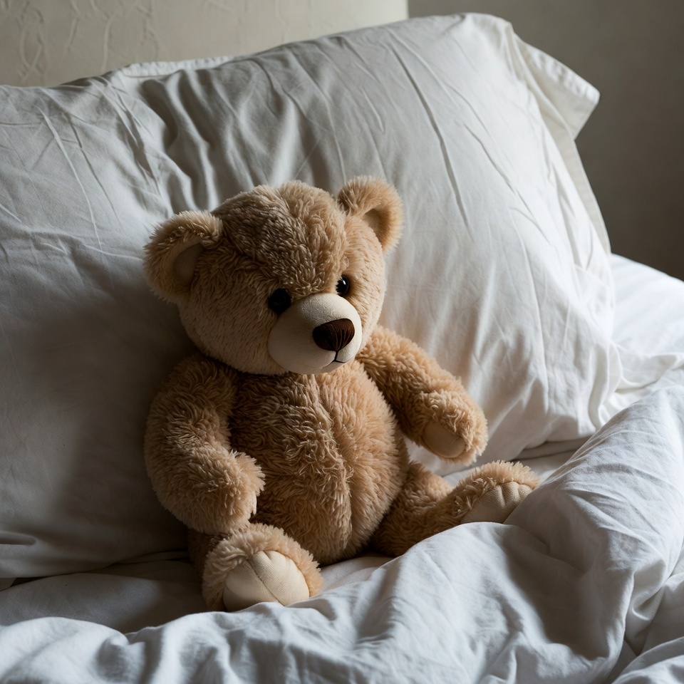 Cozy teddy bear on soft bed