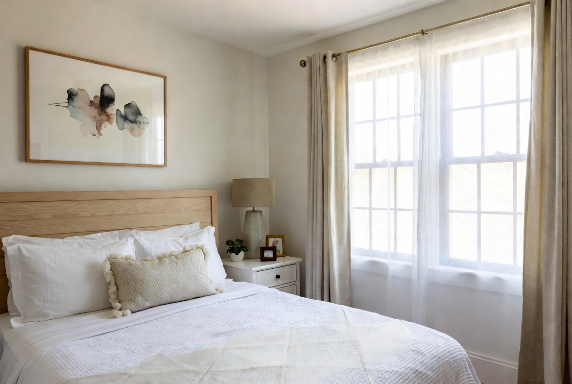 art, bedding, bedroom, bedside table, comfortable bed, cozy, curtains, decor, home, interior design, lampshade, minimalist, natural light, relaxation, simple, soft pillows, tranquility, warm colors, window, wooden furniture
