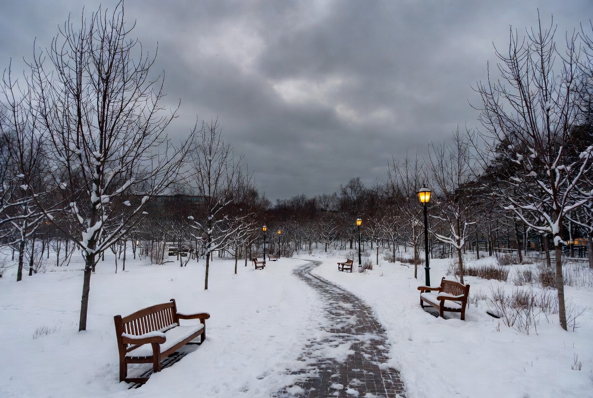 beauty, benches, calm, cloudy sky, cold, landscape, leisure, nature, outdoors, park, pathway, recreation, scenery, season, snow, streetlights, tranquility, trees, walking, winter