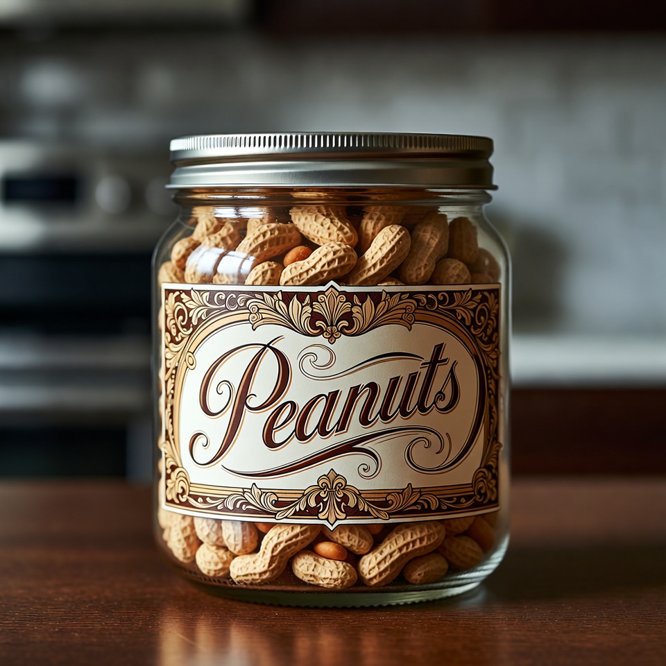 A clear jar filled with peanuts sits on a wooden table in a cozy kitchen setting, capturing a warm, inviting atmosphere.