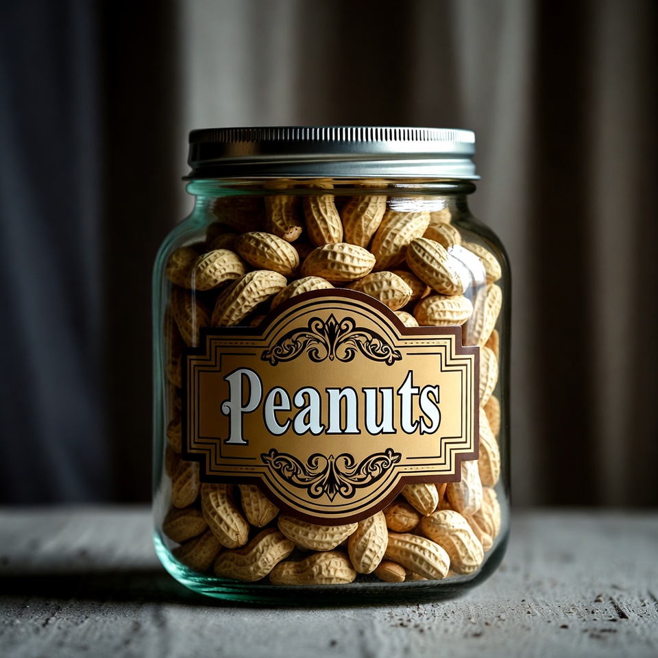 A glass jar filled with peanuts sits on a wooden table, showcasing the earthy tones and simple elegance of the snack inside.