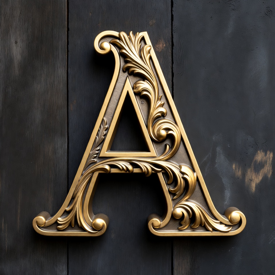 A large, ornate letter A in gold sits prominently against a dark wooden surface, showcasing intricate details and craftsmanship.