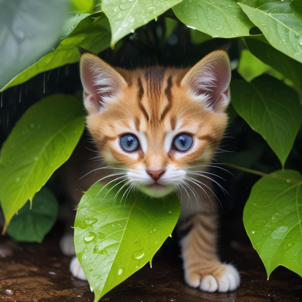 A small kitten with striking blue eyes peeks through vibrant green leaves, showcasing its playful curiosity on a rainy day.