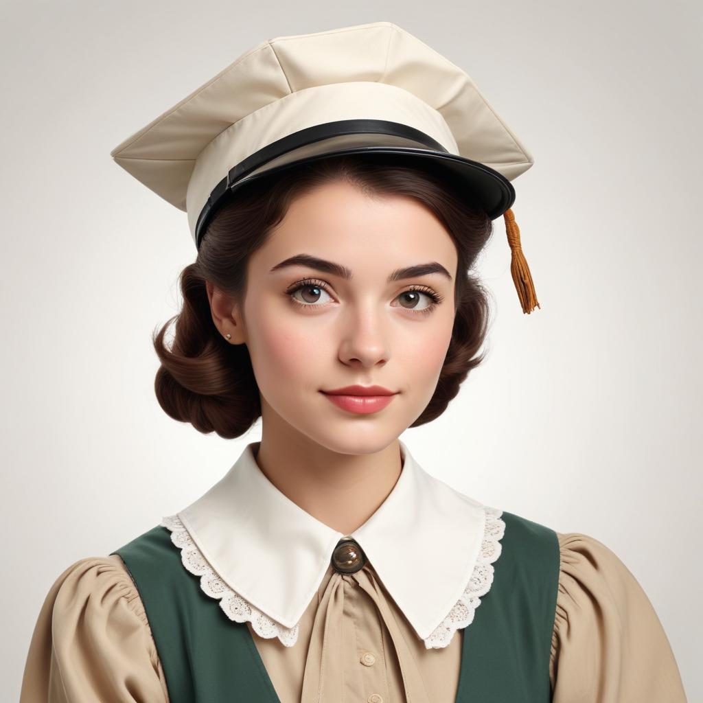 beauty, classic style, detailed collar, education, elegant, fashion, hairstyle, hat, history, makeup, nostalgia, portrait, professional, retro fashion, school uniform, soft lighting, timeless, vintage, young woman, youthful