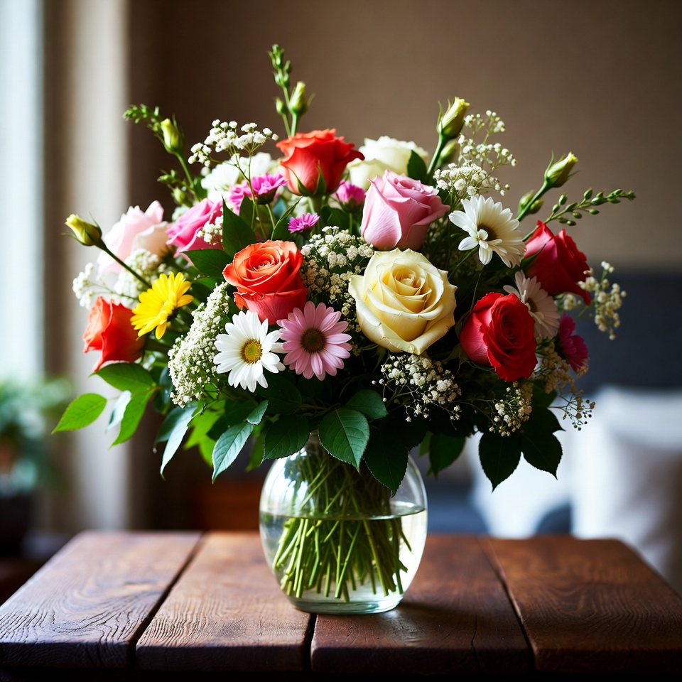 A vibrant bouquet of mixed flowers sits in a clear vase on a wooden table, brightening up the room with its colors and scents.
