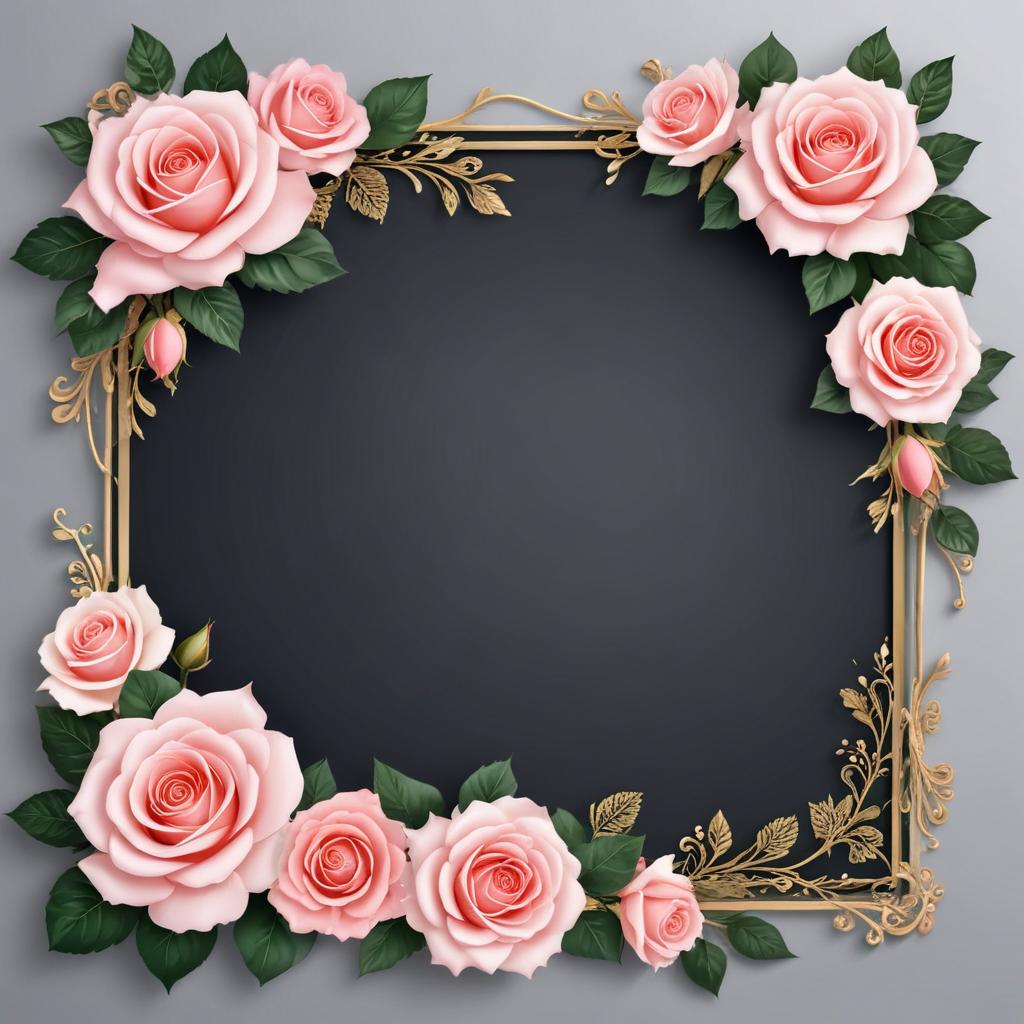 Beautiful floral frame features pink roses and green leaves on a dark background, perfect for artistic projects or invitations.