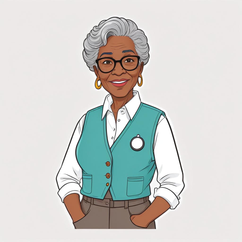 approachable, casual, character design, cheerful, clothing, community, confident, diversity, friendly, glasses, gray hair, happy, older, personality, portrait, smiling, stylish, vest, warm, woman