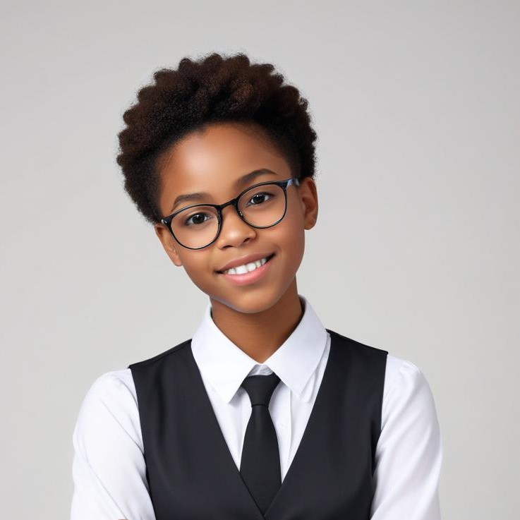 background, character, cheerful, close-up, confidence, elegant, fashion, formal attire, girl, glasses, hairstyle, outfit, personality, portrait, professional, smiles, smiling, tie, vest, youth
