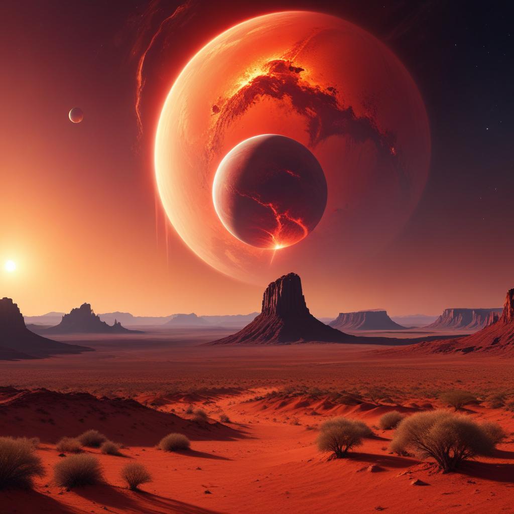 beautiful, cosmic, desert, dusk, extraterrestrial, formations, glowing, horizon, landscape, nature, planets, red, rocks, serene, sky, space, stars, twilight, universe, wilderness
