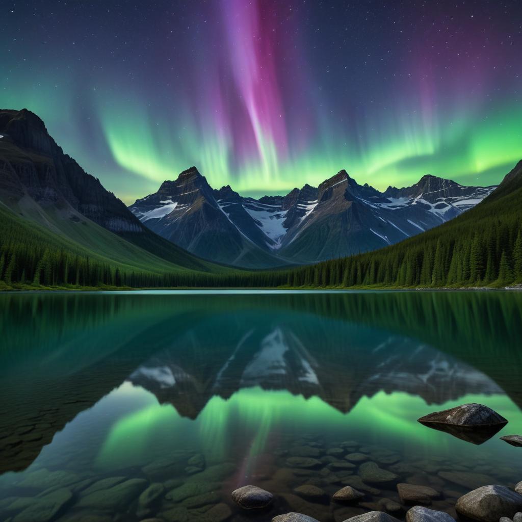 auroras, beauty, colors, green, lake, landscape, mountain, nature, night sky, northern lights, outdoor, peaceful, purple, reflection, scenery, scenic, stars, tranquility, travel, wilderness
