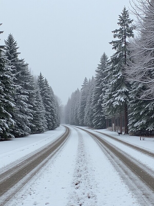 A serene winter scene features a snow-covered road flanked by tall pine trees, setting a quiet and peaceful atmosphere on a snowy day.