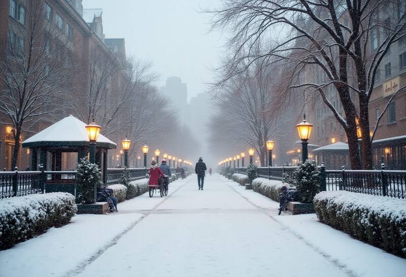 atmosphere, bench, chill, city, cold, evening, landscape, lights, outdoor, park, people, quiet, serene, snow, snowfall, snowflakes, stroll, trees, walkway, winter