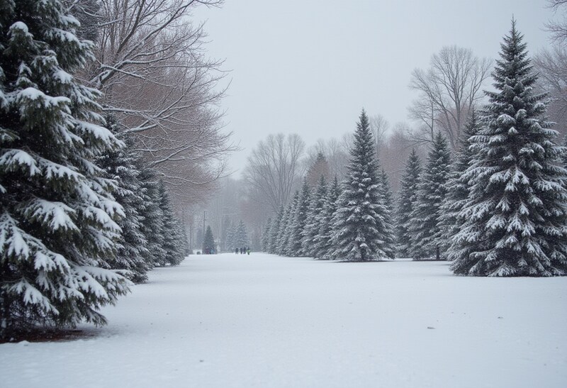 Tall evergreen trees line a snow-covered path on a cold winter day. The scene is quiet and peaceful, with snow gently falling.
