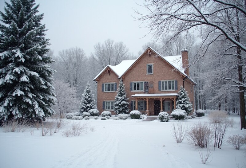 A cozy brick house surrounded by snow-covered trees and a serene white landscape invites warmth in the chilly winter.
