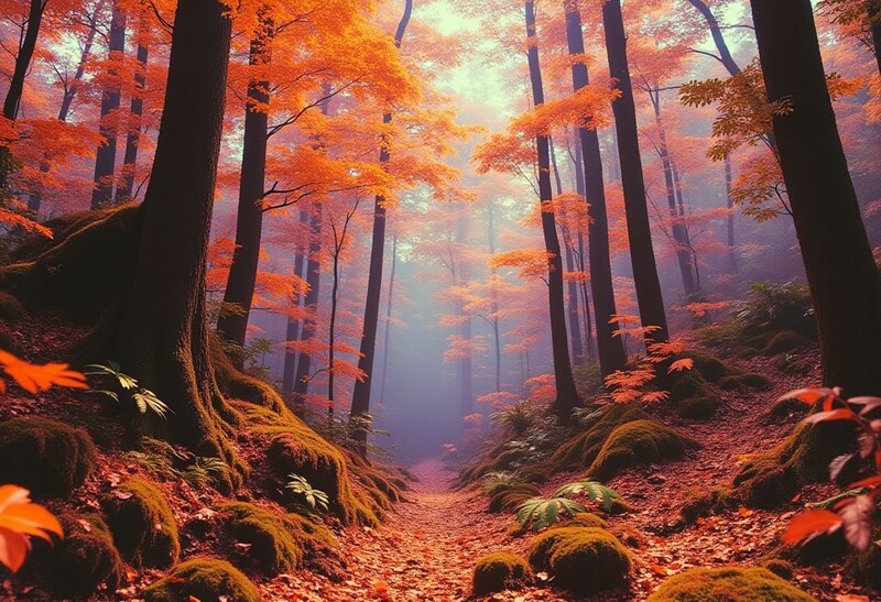 A serene forest scene showcases tall trees with bright orange leaves during autumn, creating a peaceful and enchanting atmosphere.