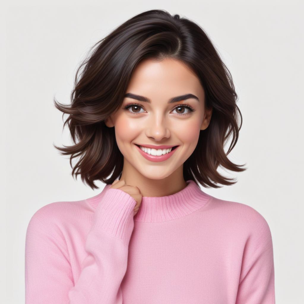 beauty, casual style, cheerful, close-up, confidence, expression, fashionable, friendly, hair, happiness, joy, light pink, natural, portrait, positive, short hair, smile, sweater, woman, young adult