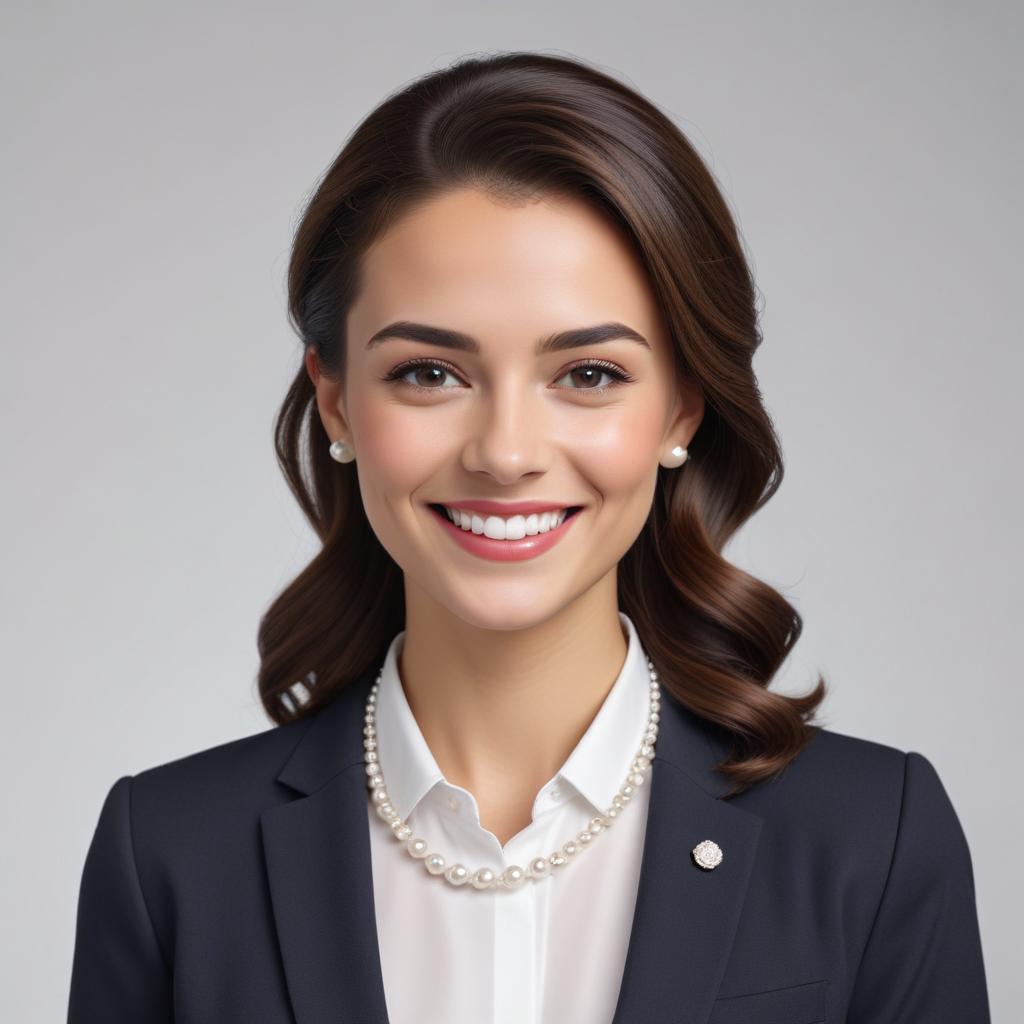 A confident young woman with dark hair smiles in formal business attire, showcasing a professional image suitable for corporate settings.
