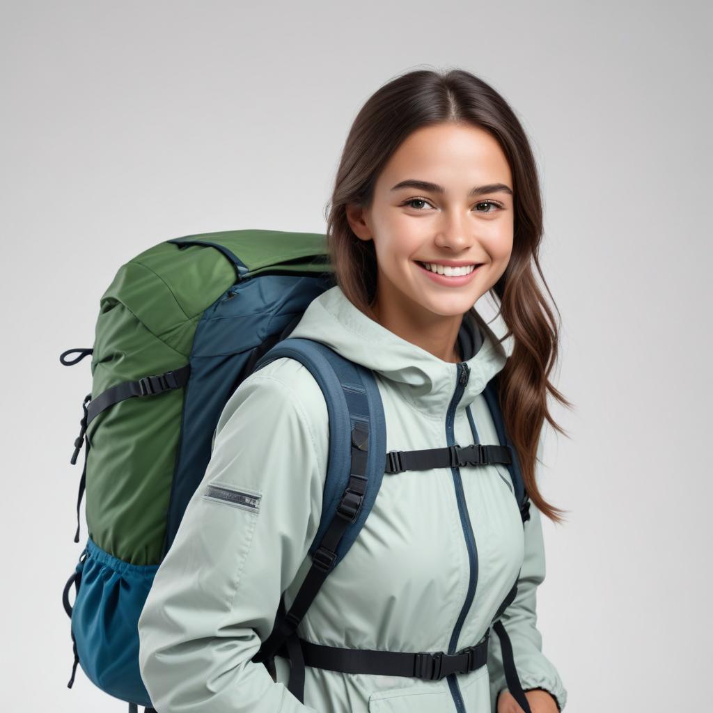 Young woman with a backpack smiles, dressed in outdoor gear, preparing for a hike in a natural setting, conveying excitement for the adventure ahead.