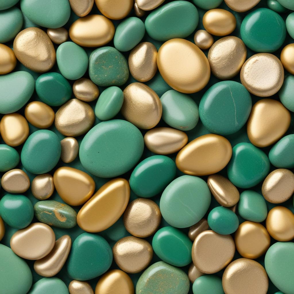 Smooth turquoise and gold stones are closely packed together, showcasing an array of shapes and sizes in a vibrant display.