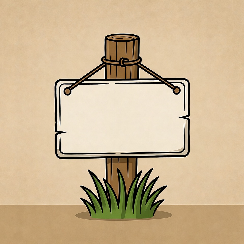 A wooden signpost stands on green grass with a blank surface, ready for messages or directions. It is set against a simple background.
