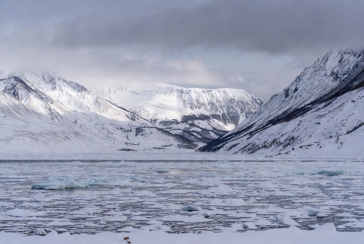 Snow covers the mountains and ground in this cold setting. Ice floats on the lake under a cloudy sky, creating a serene winter scene.