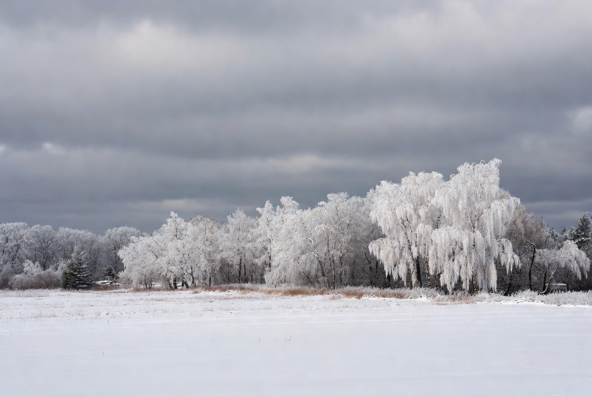 Frost coats the trees in a tranquil winter scene, creating a serene atmosphere in the cold landscape under an overcast sky.