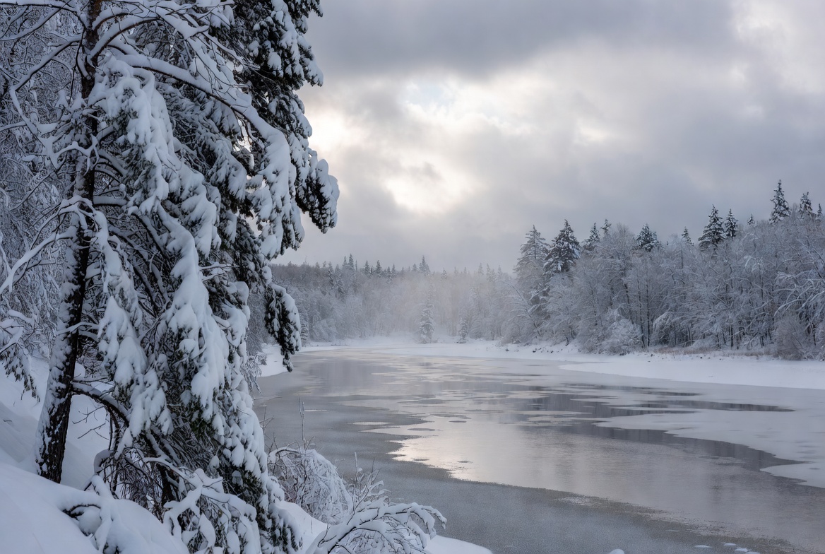 Snow-covered trees line a calm river, reflecting soft light under a cloudy winter sky. A peaceful scene of nature's beauty unfolds.