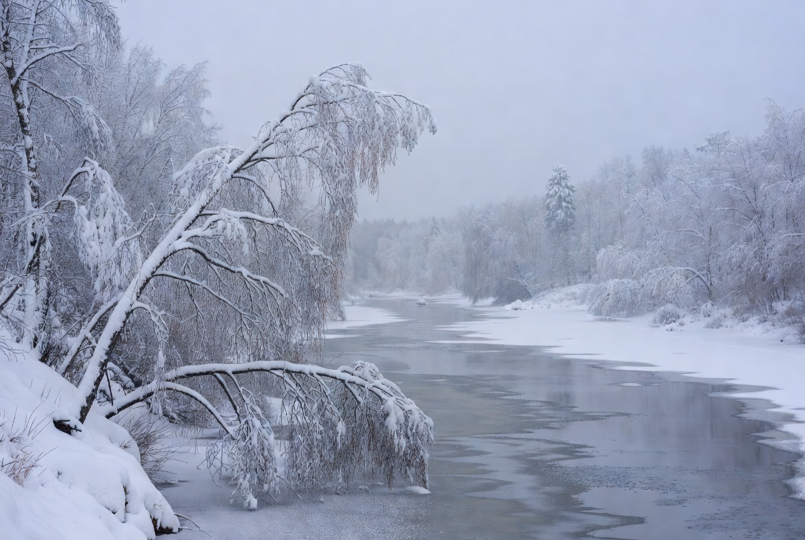 Snow-covered branches lean over a frozen river in a serene winter landscape. The soft snowfall creates a peaceful, quiet atmosphere.