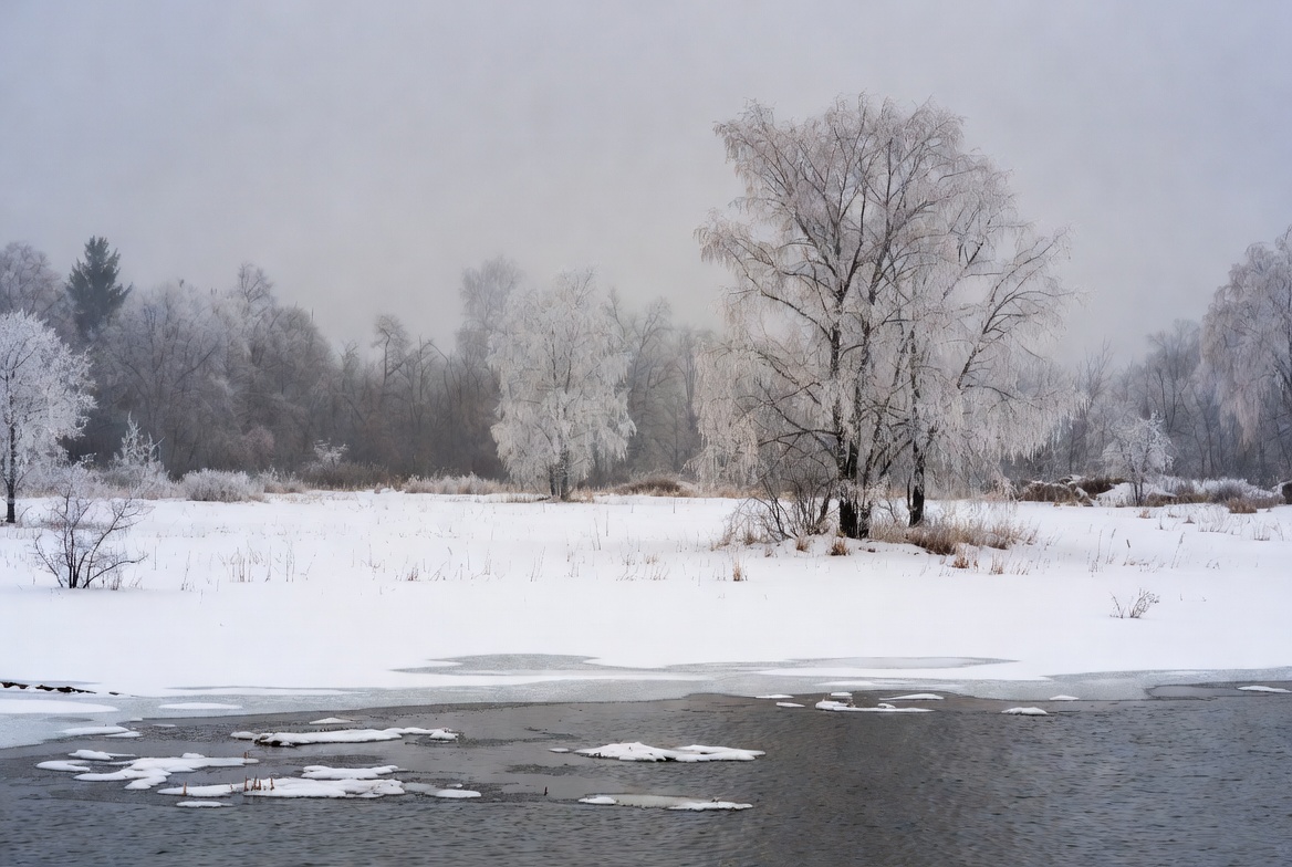 Snow covers the landscape, with trees frosted and a quiet river flowing through the scene, evoking a serene winter atmosphere.