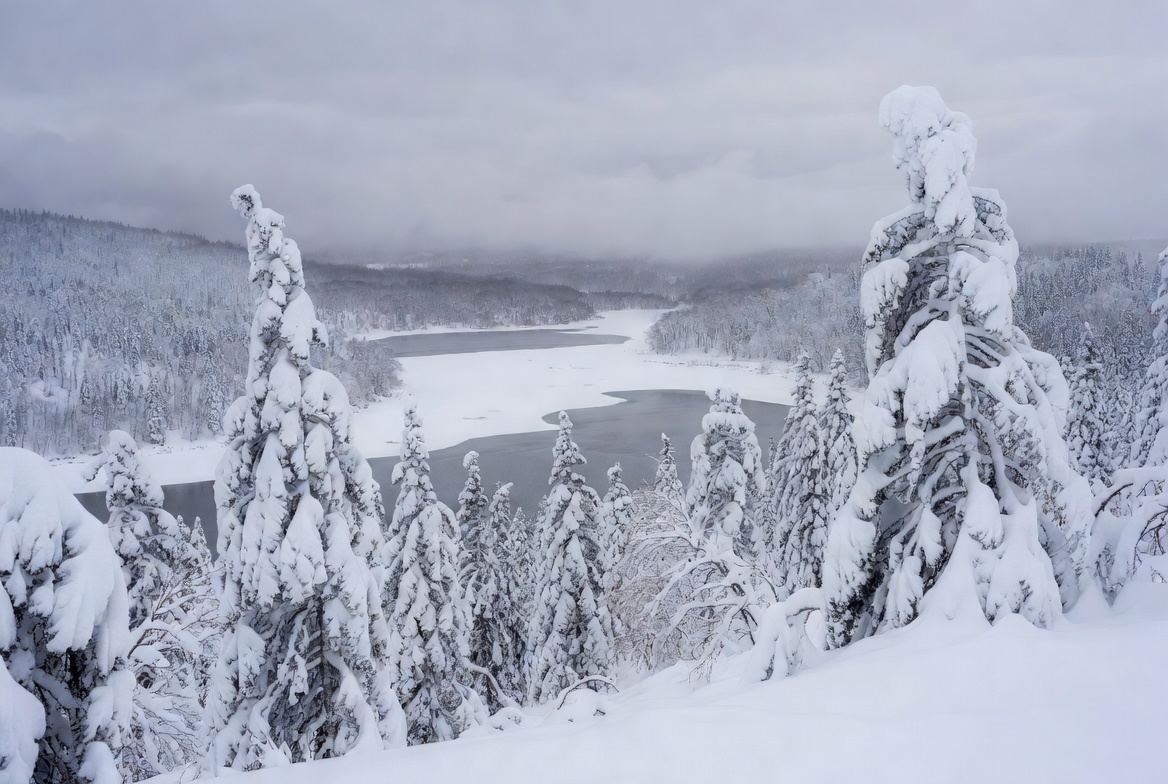 Snow blankets the trees in a serene winter scene by a quiet lake. Cloudy sky looms overhead, adding a calm ambiance to the area.
