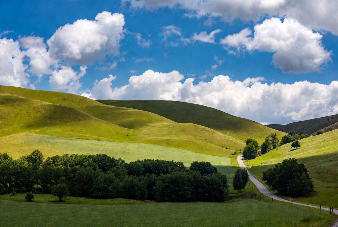beauty, bright, clouds, countryside, environment, greenery, hills, landscape, nature, outdoors, peaceful, roads, scenic, shadows, summer, sunlight, tranquility, travel, trees, vista