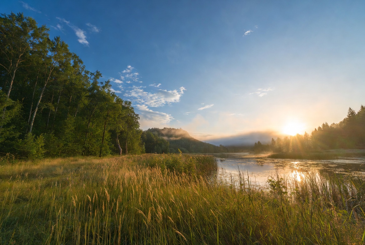 Early morning light illuminates a tranquil lake surrounded by trees and tall grass. Mist hovers over the water, creating a peaceful scene.