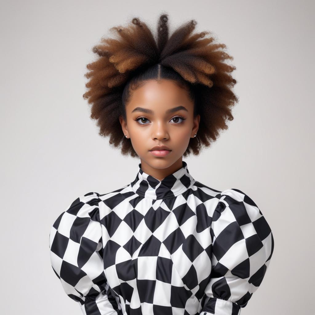 afro hairstyle, beauty, confident, contemporary, creative, design, elegance, expression, fashion, fashion industry, hairstyle, makeup, model, neutral background, patterned dress, portrait, stylish, trendy, visual art, young woman