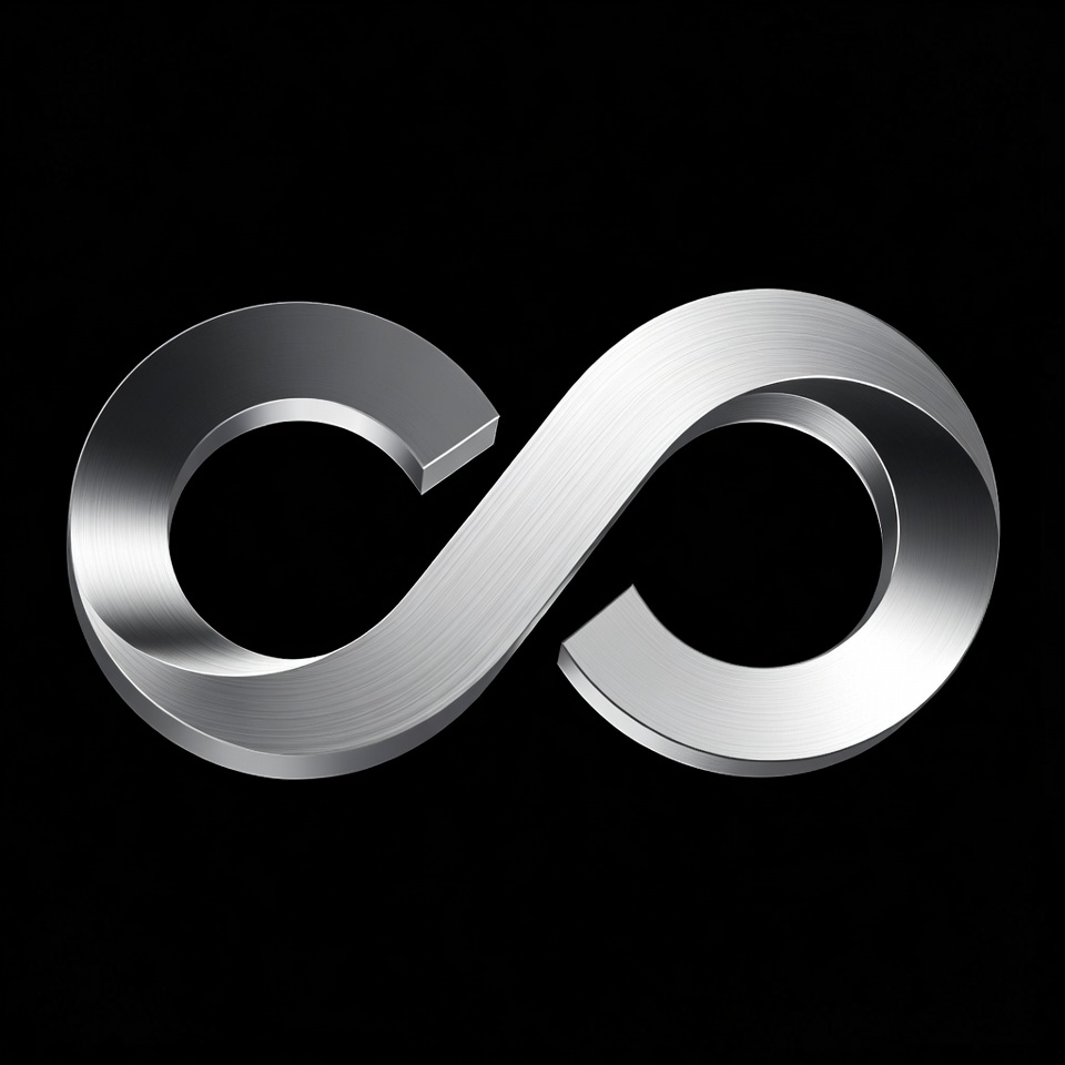 Silver infinity symbol crafted from metal sits against a black background, showcasing its sleek and modern design in a minimalistic way.