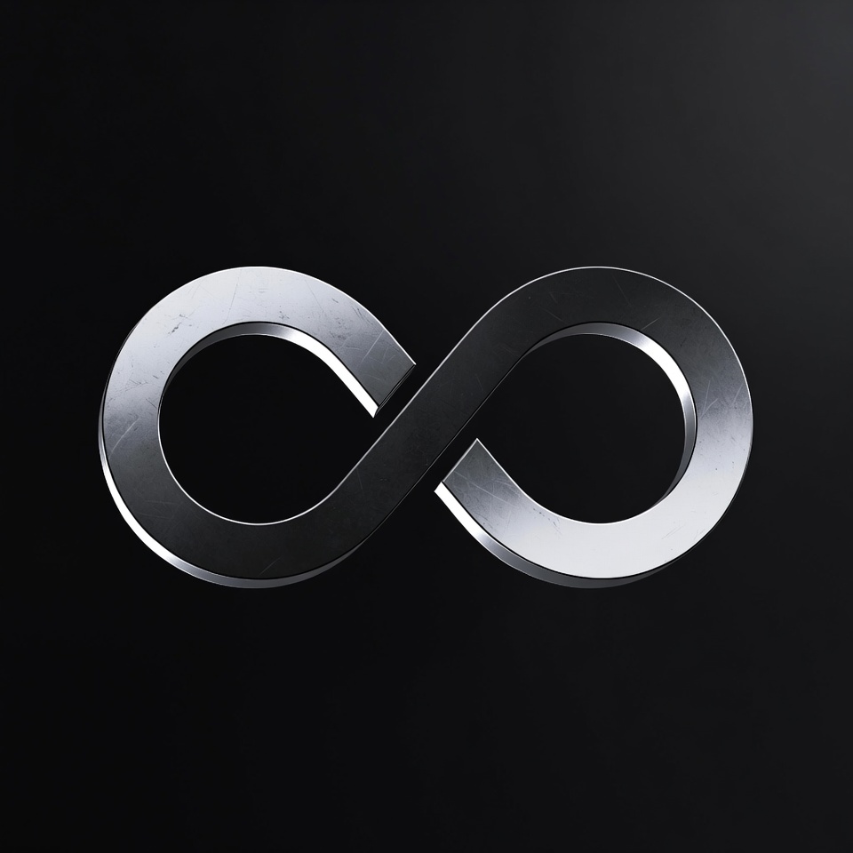 A sleek and shiny infinity symbol is centered against a dark background. This design represents endless possibilities and continuity.
